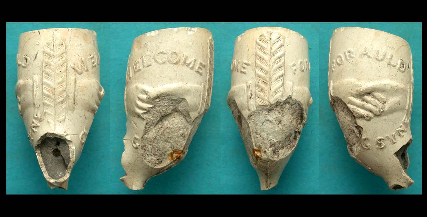 Seller's Note/ This pipe is special as it clearly reads WELCOME G[UEST] with clasping hands on one side and For Auld Lang Syne (for the sake of old times) and another pair of clasping hands on the other; feather motif fore and aft. Ground found at the Battle of Gettysburg, this is perfect for discerning US Civil War collectors.