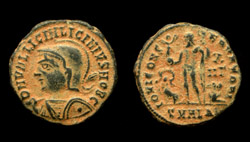 Obv/ DN VAL LICIN LICINIVS IVN NOB C; helmeted and cuir. bust l., holding shield and spear.
