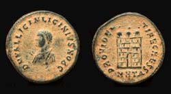 Obv/ DN VAL LICIN LICINIVS NOB C; laurelate small bust left wearing Imperial mantle, holding mappa, globe and scepter.