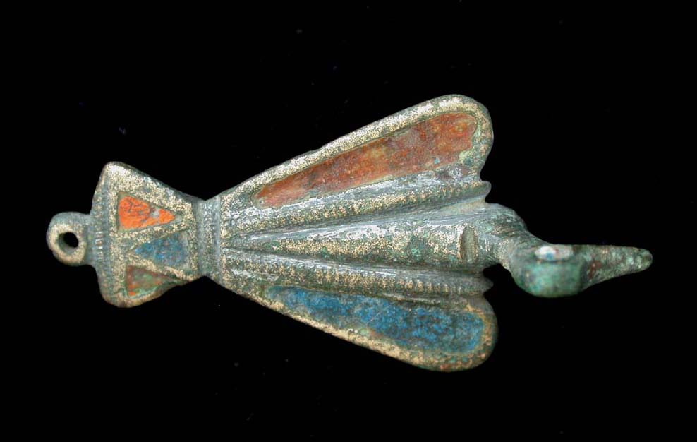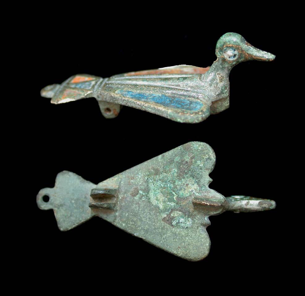 Seller's Note/ Charming example of a water fowl in flight... Note that the circlet on the tail of this fibula was designed so it could be worn as either a brooch or pendent. The lovely blue and orange enameling is truly spectacular as such rarely, if ever, survives 1,900 years in the ground. Trust me, I know.