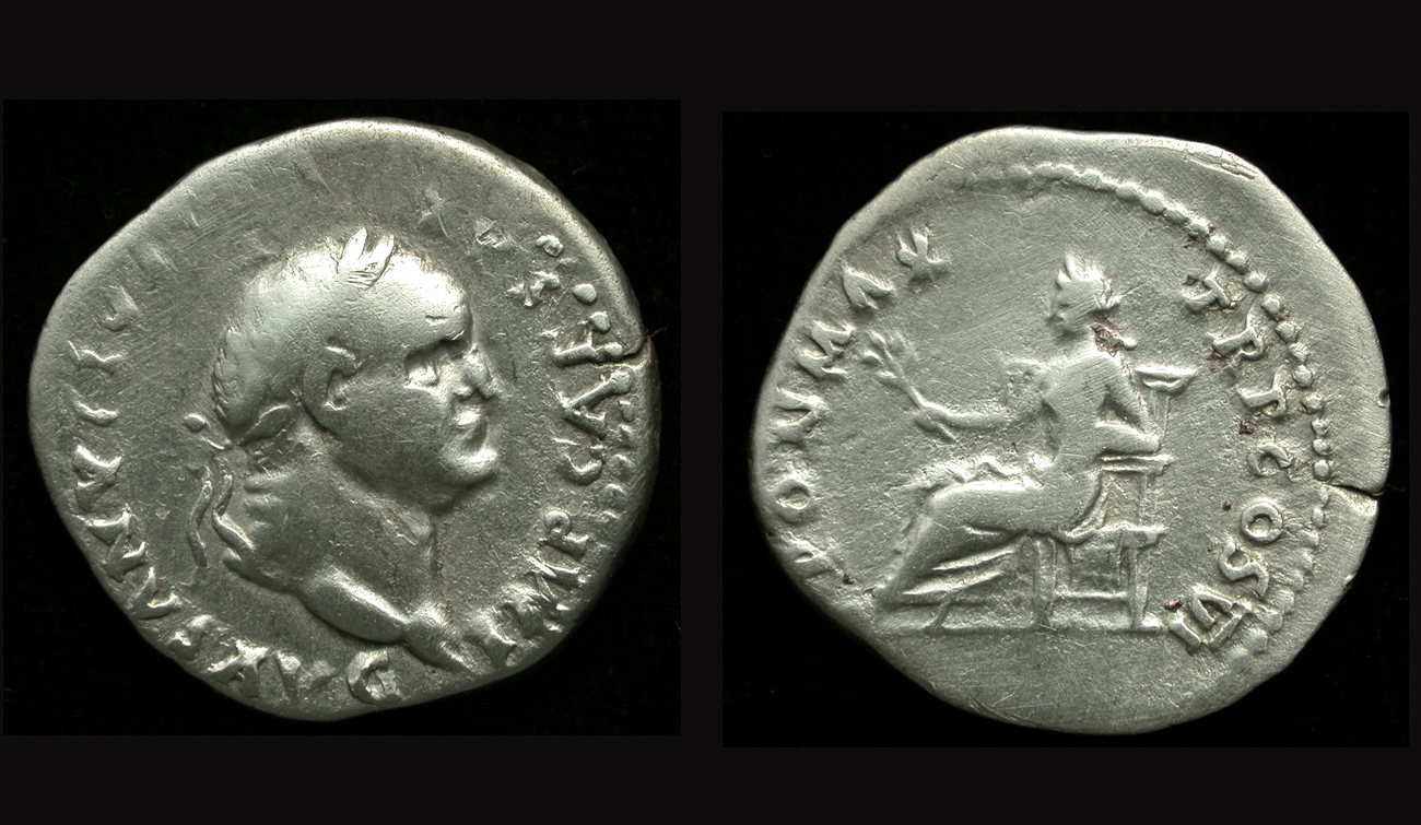 Obv/ IMP CAESAR VESPASIANVS AVG (counter clockwise); laureate head right.