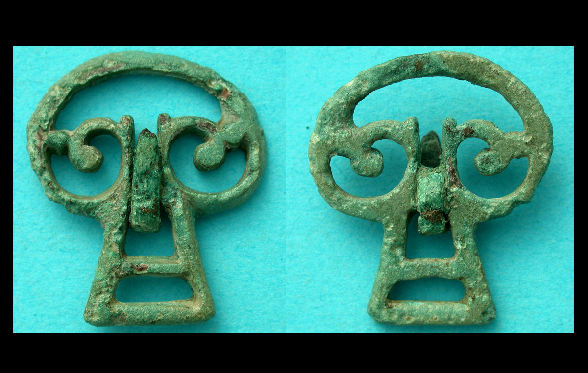 Seller's Note/ This early 2nd century buckle exhibits internal scrolling that merges with the buckle frame above the strap connector. First time listing such a buckle on NRC!