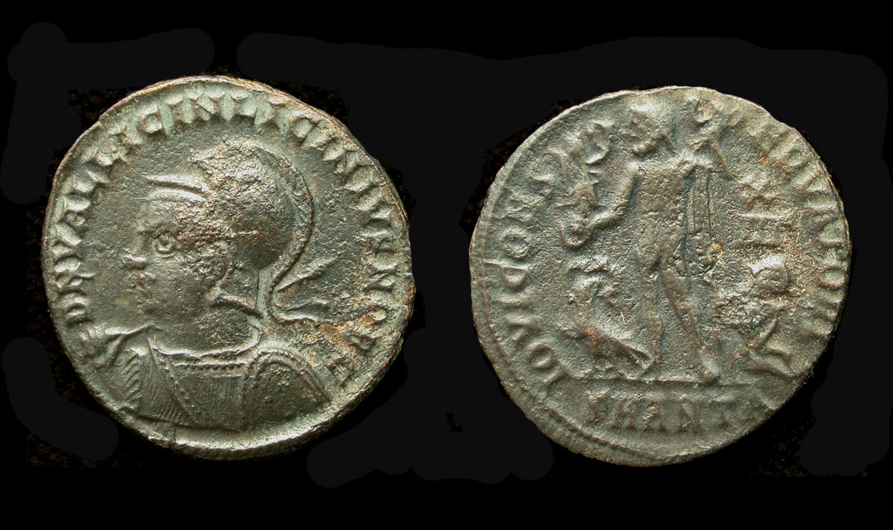 Obv/ DN VAL LICIN LICINIVS IVN NOB C; helmeted and cuir. bust l., holding shield and spear.