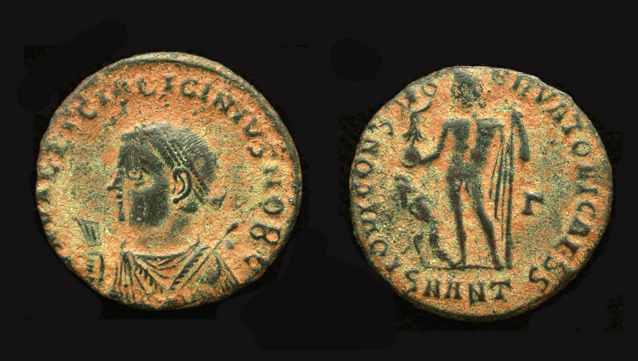 Obv/ DN VAL LICIN LICINIVS IVN NOB C; laur. bust left, wearing Imperial mantle, holding mappa, globe and scepter.