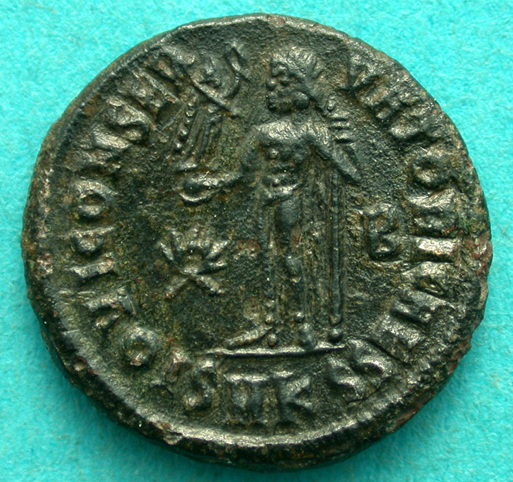 Rev/ IOVI CONSERVATORI CAESS; Jupiter stg. l, chalmys across l. shoulder, holding Victory on globe and scepter; Wreath/B in opposing fields.