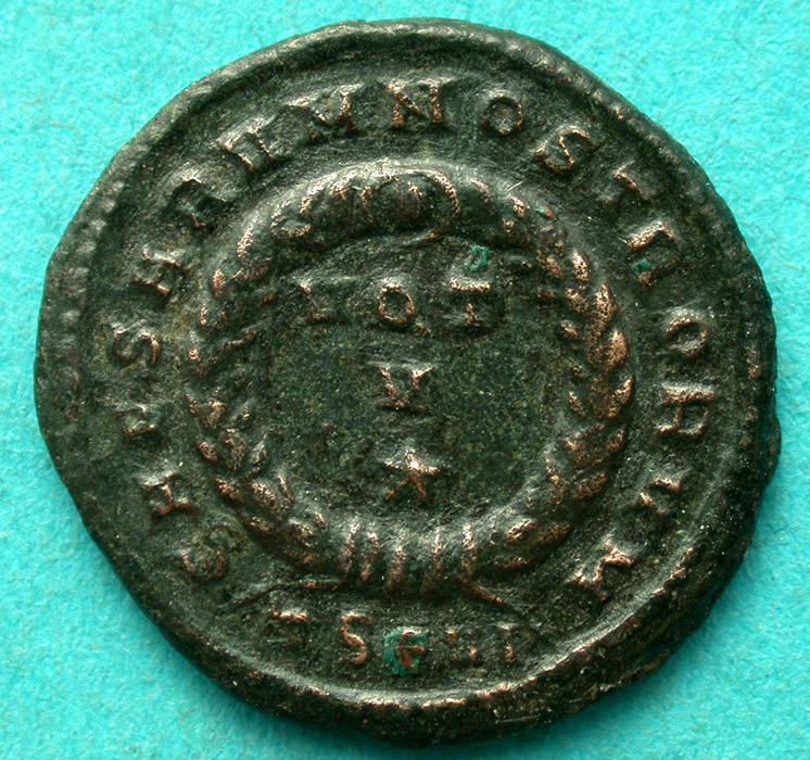 Rev/ CAESARVM NOSTRORVM; VOT/V/* (Star) in three lines within laurel wreath.