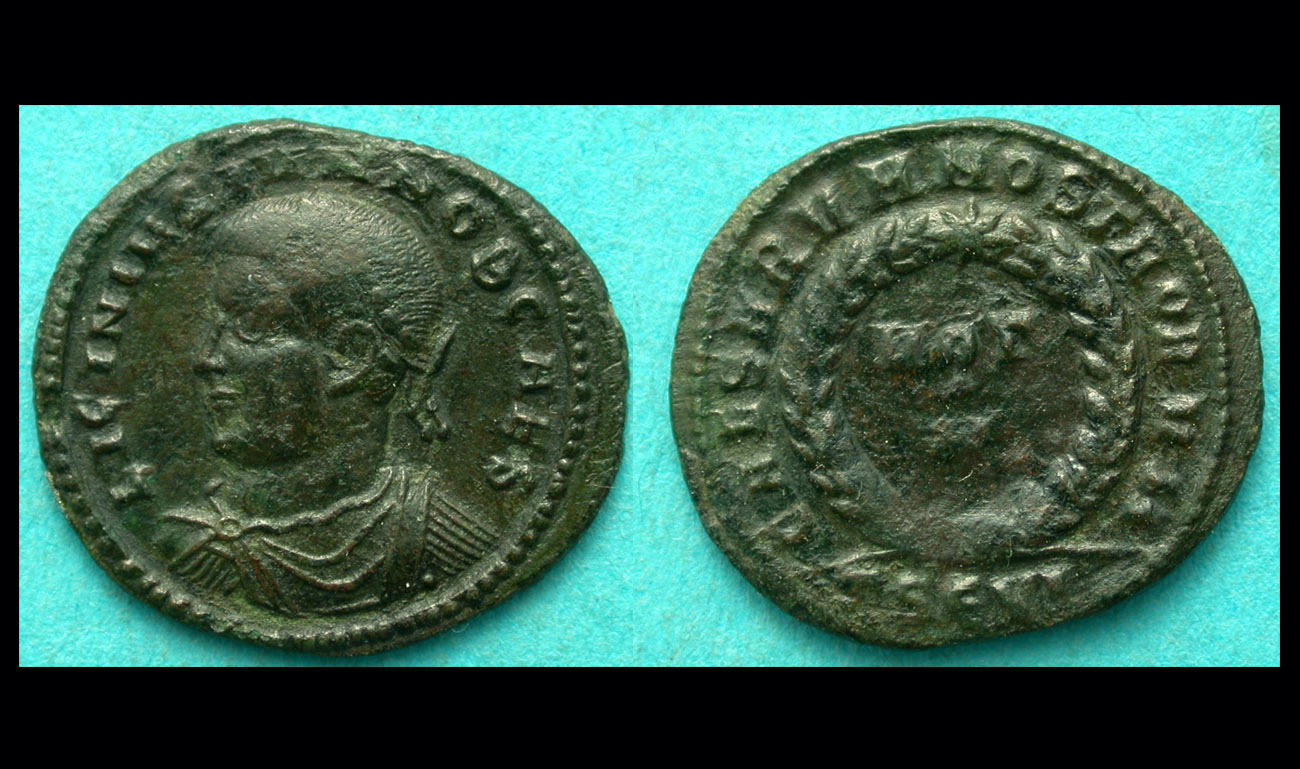 Obv/ LICINIVS IVN NOB CAES; laur., dr., and cuir. bust left.
