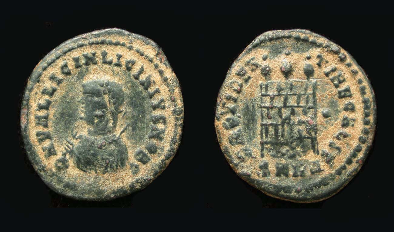 Obv/ DN VAL LICIN LICINIVS NOB C; laurelate small bust left wearing Imperial mantle, holding mappa, globe and scepter.