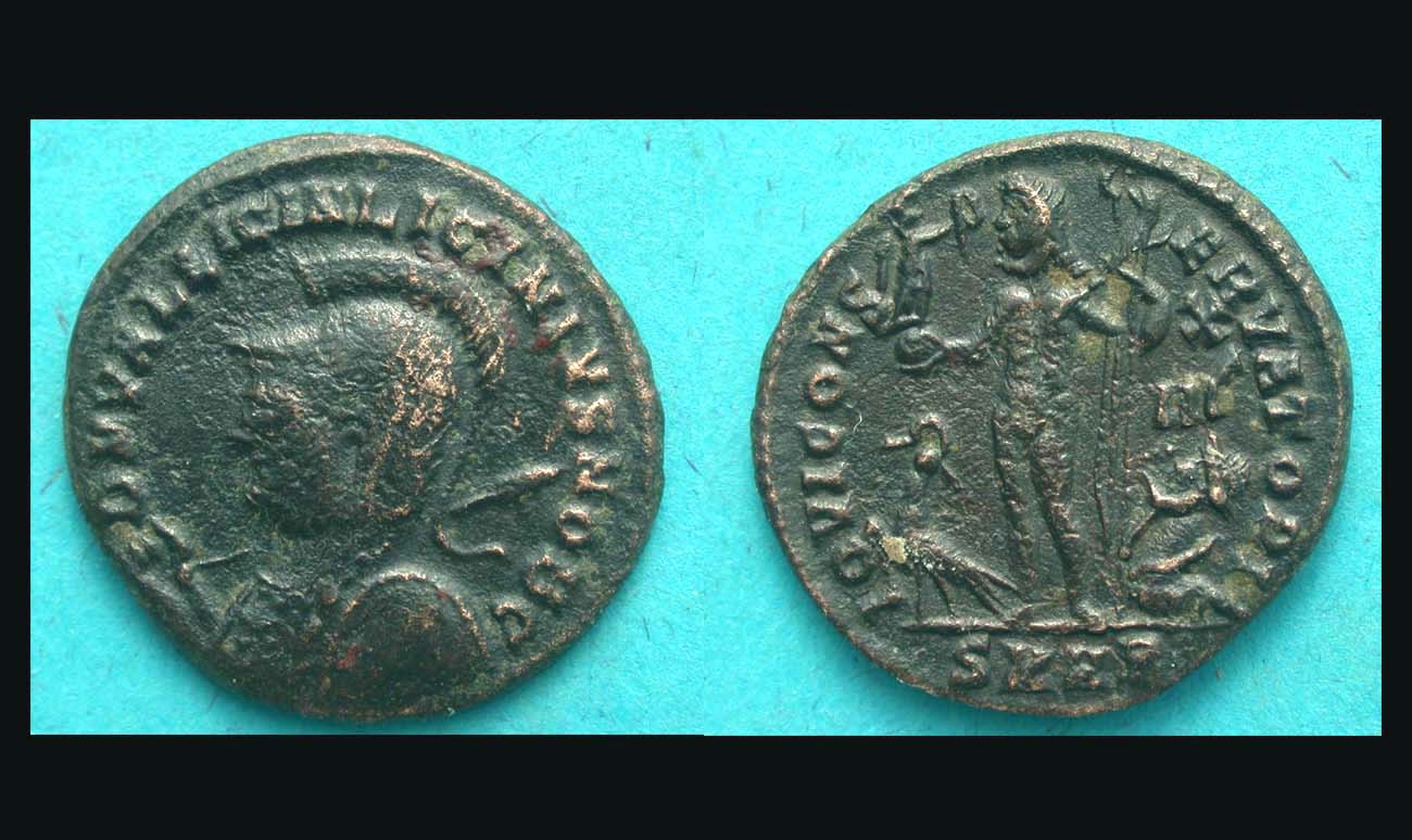 Obv/ DN VAL LICIN LICINIVS IVN NOB C; helmeted and cuir. bust left, holding spear and shield.