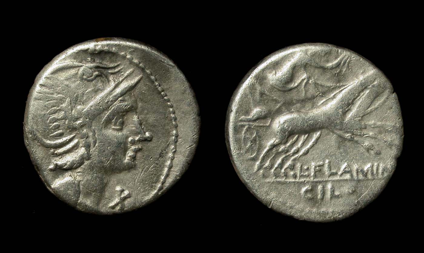 Rev/ Victory driving fast biga to right, holding reins in her left hand and wreath in right. Below, L FLAMIN CILO.