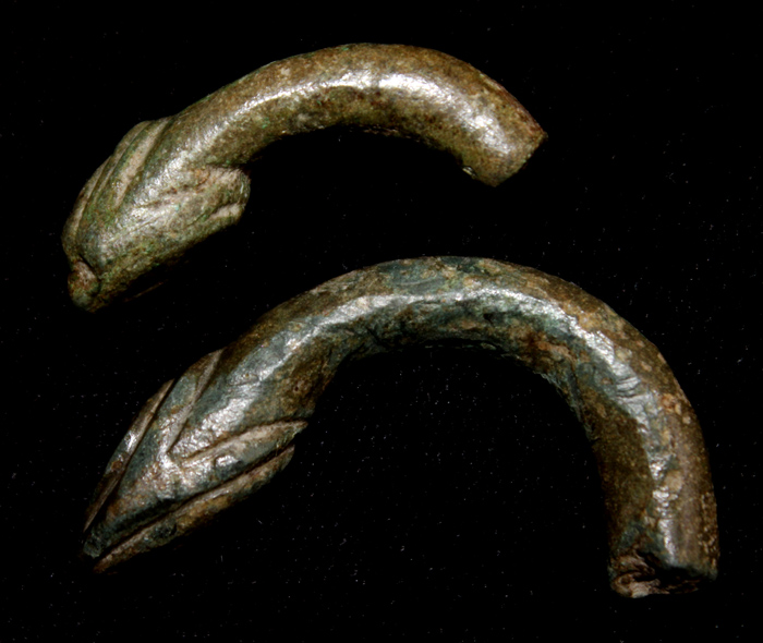 Con/ green patina, cleaned and waxed. Both are plow-broken fragments that would have had a swan-neck shape with a connector loop on the end.